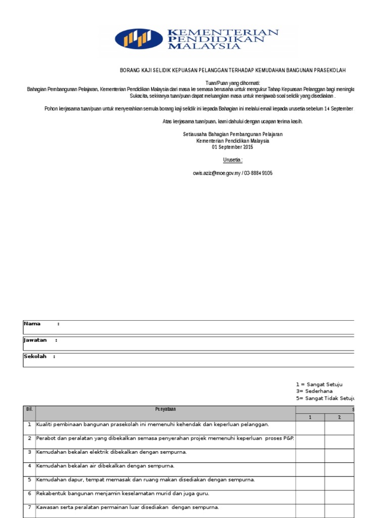 Borang kaji selidik kepuasan pelanggan unit pos & kenderaan, bahagian pentadbiran bahagian ini sedang berusaha untuk meningkatkan kualiti perkhidmatan kepada semua pelanggan. Tuan/puan adalah dipohon untuk memberikan maklum balas dan komen yang. Assalamualaikum/salam sejahtera, soal selidik ini dibentuk untuk mendapatkan maklumbalas tentang hubungan kejiranan di bandar putra, klang. Bersaing di pasaran dan mencipta kejayaan. Borang kaji selidik kepuasan pelanggan c.