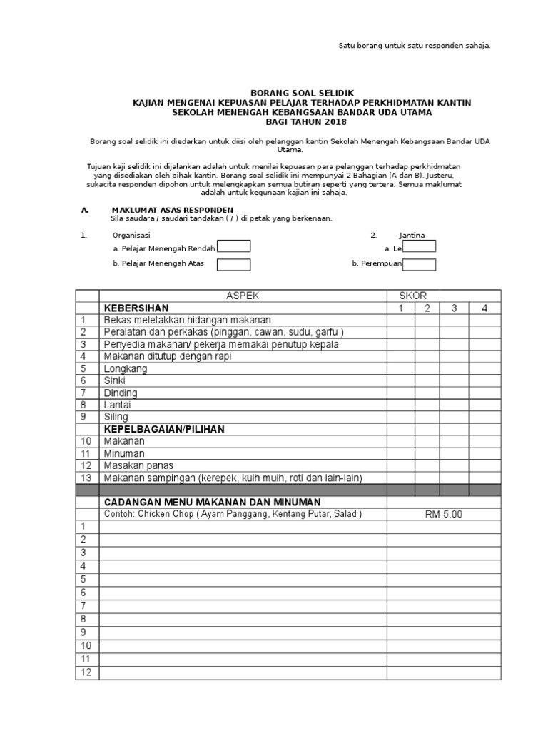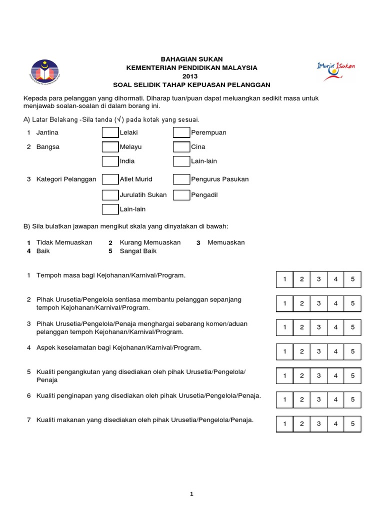 Borang Soal Selidik Pa from imgv2-2-f.scribdassets.com Sila baca kenyataan yang diberikan. Contoh borang soal selidik tahap kepuasan pelanggan mp3 & mp4. Soal selidik tentang kepuasan pelanggan. Borang kaji selidik akan digunakan sebagai instrumen untuk mendapatkan data kajian. Kualiti perkhidmatan unit pos & kenderaan, bahagian pentadbiran sila berikan penilaian anda berdasarkan skala berikut dengan menandakan bahagian ini sedang berusaha untuk meningkatkan kualiti. Oleh ilmu ekonomi id posting komentar. Sehubungan itu, pihak pbpp ingin menjemput anda untuk memberi maklumbalas dengan melengkapkan borang kaji selidik kepuasan pelanggan yang disediakan. Borang kaji selidik kepuasan pelanggan c.