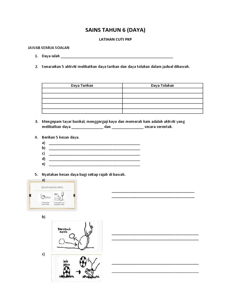 Daya Tarikan Dan Tolakan Sains Tahun 6 Worksheet from files.liveworksheets.com Jenis daya add to my workbooks (3) download file pdf embed in my website or blog add to google classroom Cikgu wan nurshida ayu binti wan hussin. Salam perpaduan dan salam belajar sains. Daya tolakan tin berubah bentuk dan menjadi kemektin yang elokmengubah arah pergerakan objek2apabila bulu tangkis (objek) yang sedang. Tarikan yang boleh mengubah arah. Nota ringkas sains tahun 6 unit 1: Merupakan tarikan atau tolakan yang bertindak ke atas sesuatu objekdaya tarikan. Daya geseran & faktor mempengaruhi geseran.